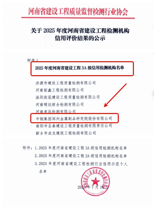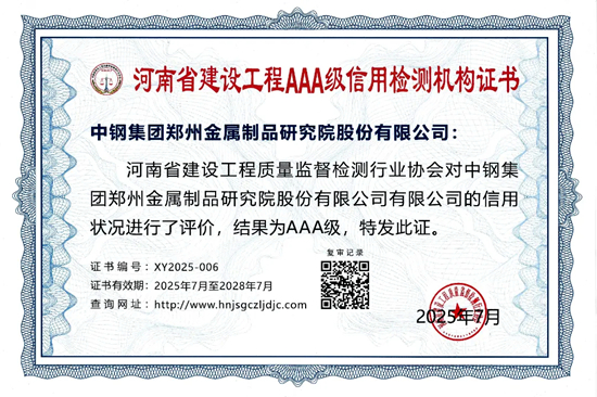 中鋼制品院榮獲2025年度河南省建設工程3A級信用檢測機構證書